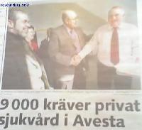 Så här gör man inte bra PR. Hela grejen handlar om att man samlat in namnunderskrifter för bättre sjukvård i Avesta. Men bilden från överlämnandet av namnunderskrifterna motsäger hela grejen – det ser mer ut som de överlämnar en present till Alf Johansson som tack för fina tjänster.